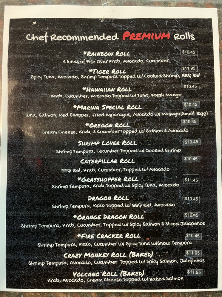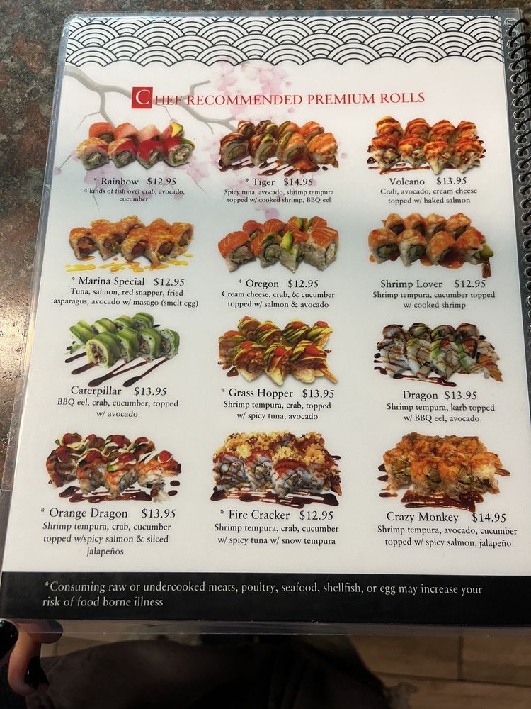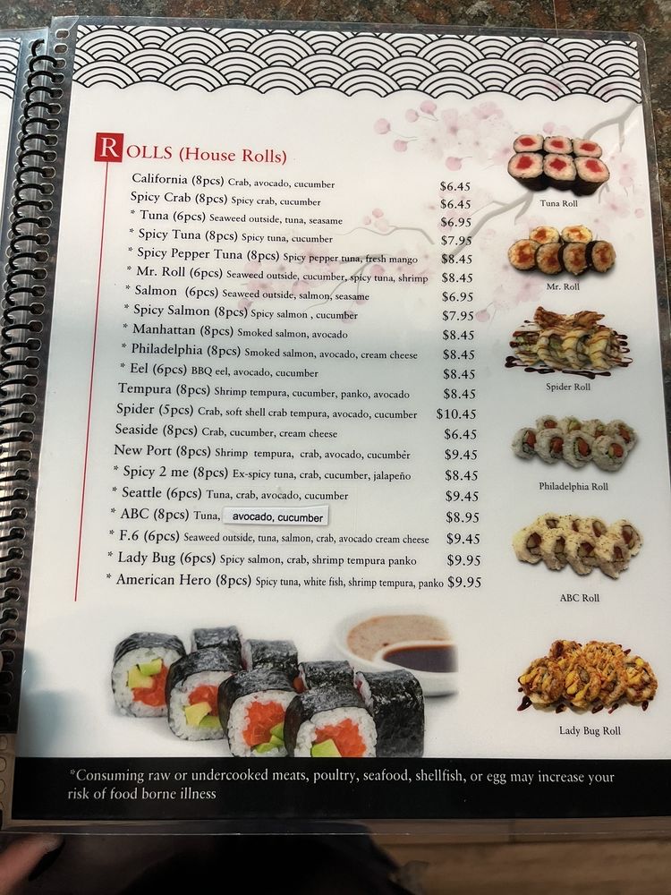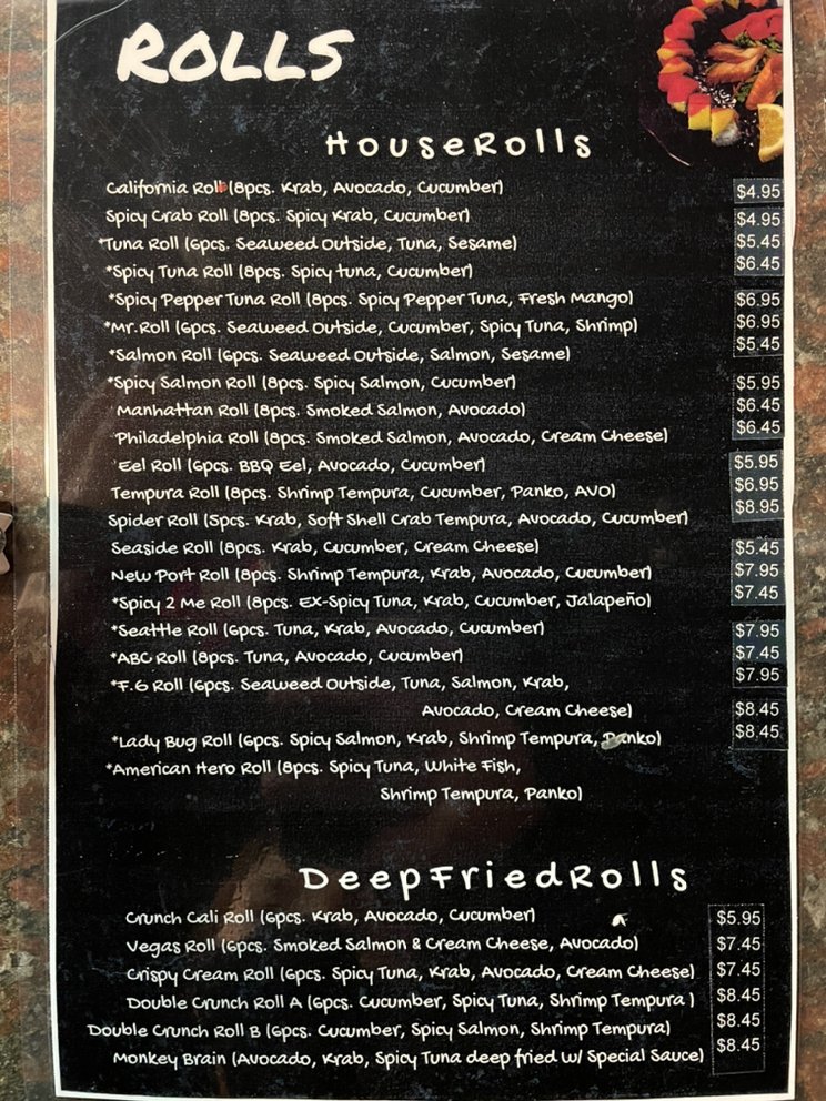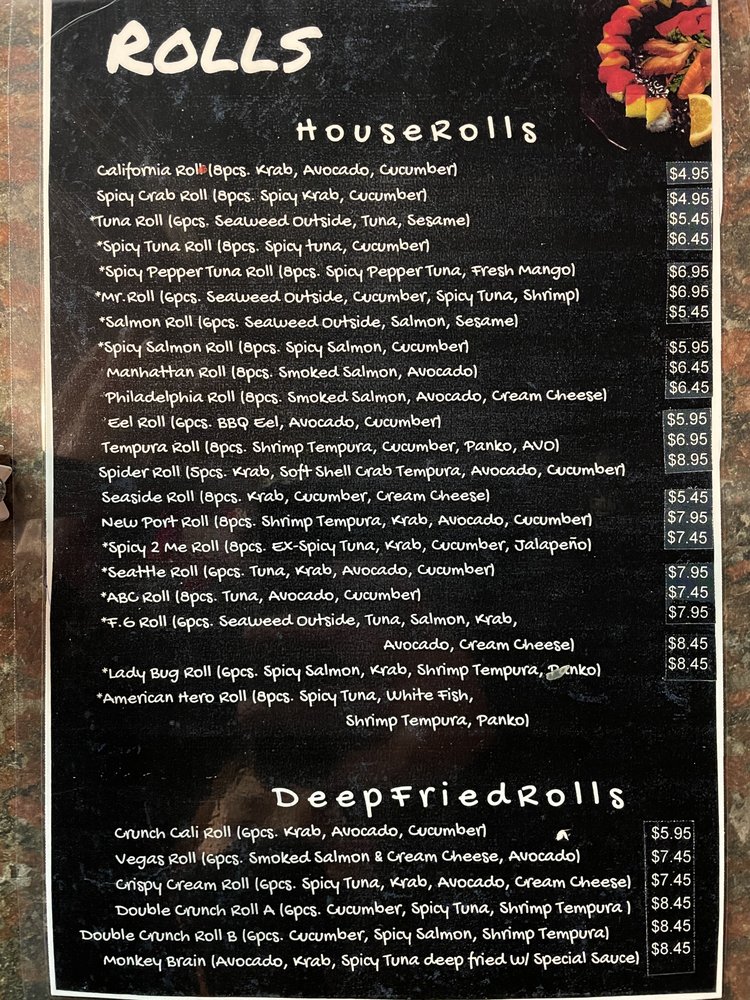 Seaweed outside, tuna, salmon, crab, avocado cream cheese